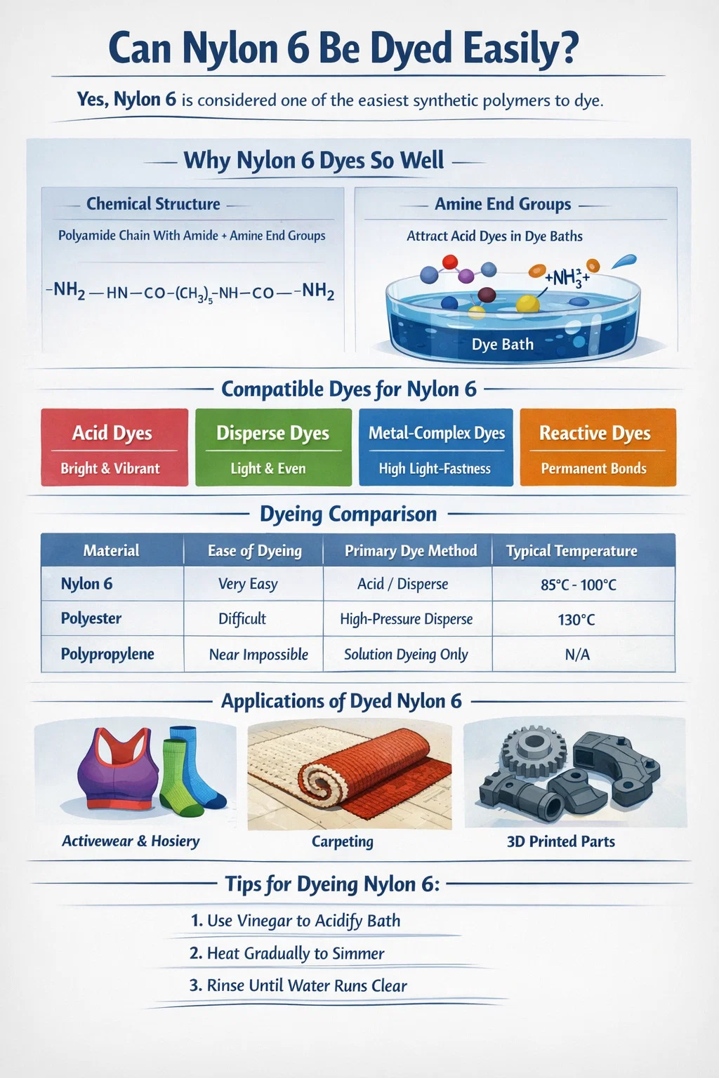 Vâng, nylon 6 được coi là một trong những polyme tổng hợp dễ nhuộm nhất , đặc biệt khi so sánh với các loại nhựa khác như polyester hoặc polypropylene. Cấu trúc hóa học độc đáo của nó chứa nhiều vị trí phản ứng cho phép các phân tử thuốc nhuộm hình thành các liên kết bền vững và bền vững. Ái lực cao đối với chất tạo màu này có nghĩa là Nylon 6 có thể đạt được màu sắc sống động, sâu sắc và độ bền màu tuyệt vời sử dụng quy trình nhuộm nước tiêu chuẩn ở nhiệt độ tương đối thấp.