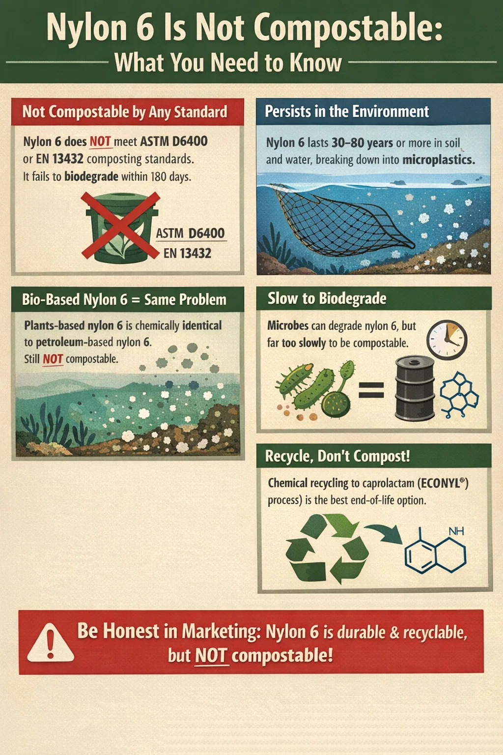 nylon 6 không thể phân hủy được trong bất kỳ điều kiện ủ phân tiêu chuẩn nào - cả phân bón tại nhà lẫn phân bón công nghiệp. Nó là một loại polymer tổng hợp có nguồn gốc từ nguyên liệu hóa dầu và cấu trúc phân tử của nó không bị phá vỡ thông qua các quá trình sinh học phân hủy chất hữu cơ. Trong môi trường phân trộn điển hình, nylon 6 sẽ vẫn còn nguyên vẹn về mặt cấu trúc trong nhiều thập kỷ, có thể là hàng thế kỷ mà không bị phân hủy đáng kể.