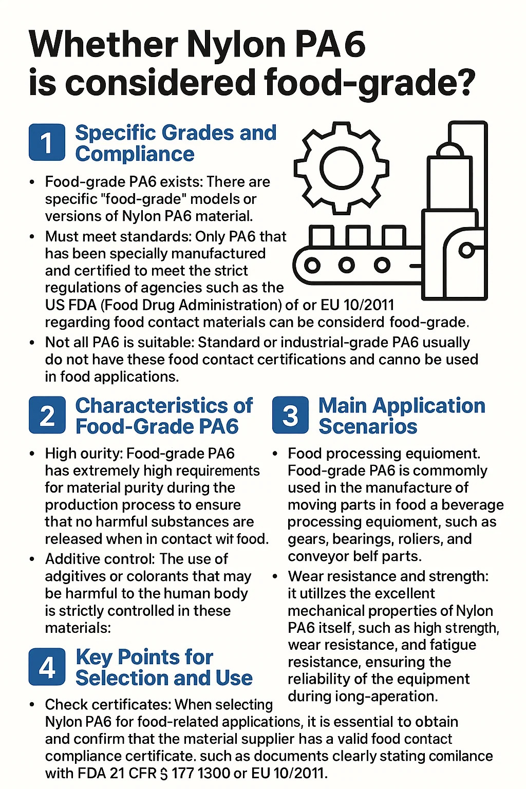 Không phải tất cả PA6 đều phù hợp: PA6 tiêu chuẩn hoặc cấp công nghiệp thường không có các chứng nhận tiếp xúc với thực phẩm này và không thể sử dụng trong các ứng dụng thực phẩm.