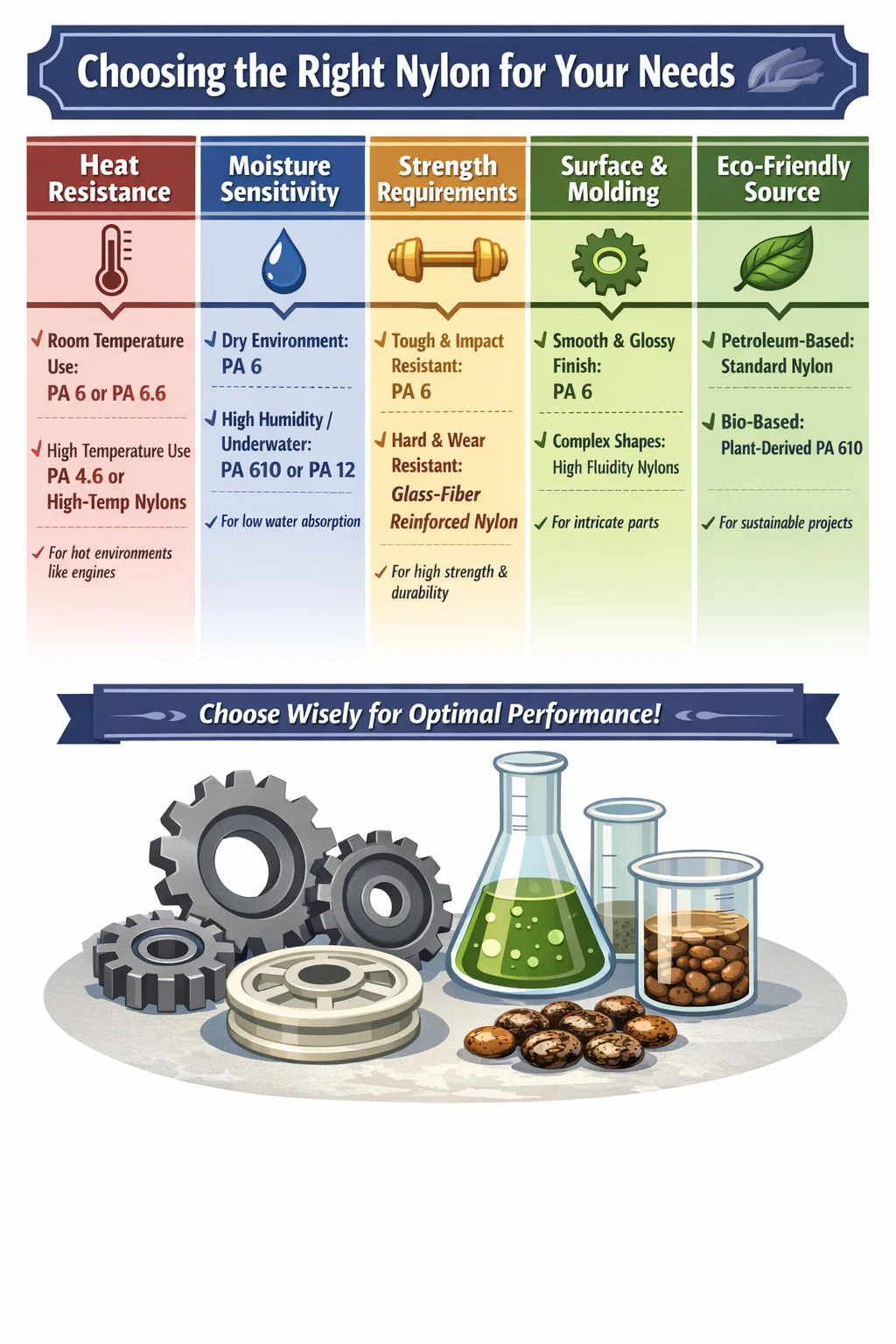 Sử dụng chung trong gia đình hoặc công nghiệp thông thường: Nếu bộ phận chỉ hoạt động ở nhiệt độ phòng hoặc trong môi trường ôn hòa, thì kiểu cổ điển Polyamit 6 hoặc PA 6.6 là đủ. Chúng tiết kiệm chi phí và có thể xử lý hầu hết các tình huống hàng ngày.