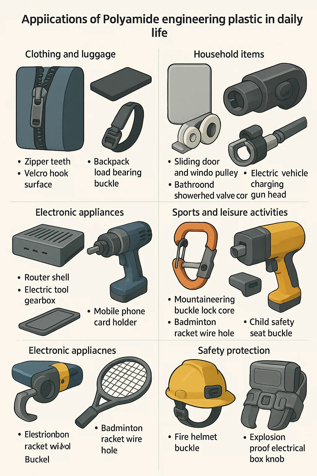 Ứng dụng của Kỹ thuật nhựa polyamide Trong cuộc sống hàng ngày thấm vào nhiều lĩnh vực, và giá trị cốt lõi của nó nằm ở đặc điểm của việc thay thế thép bằng nhựa và nhẹ và bền. Các kịch bản điển hình cụ thể như sau: