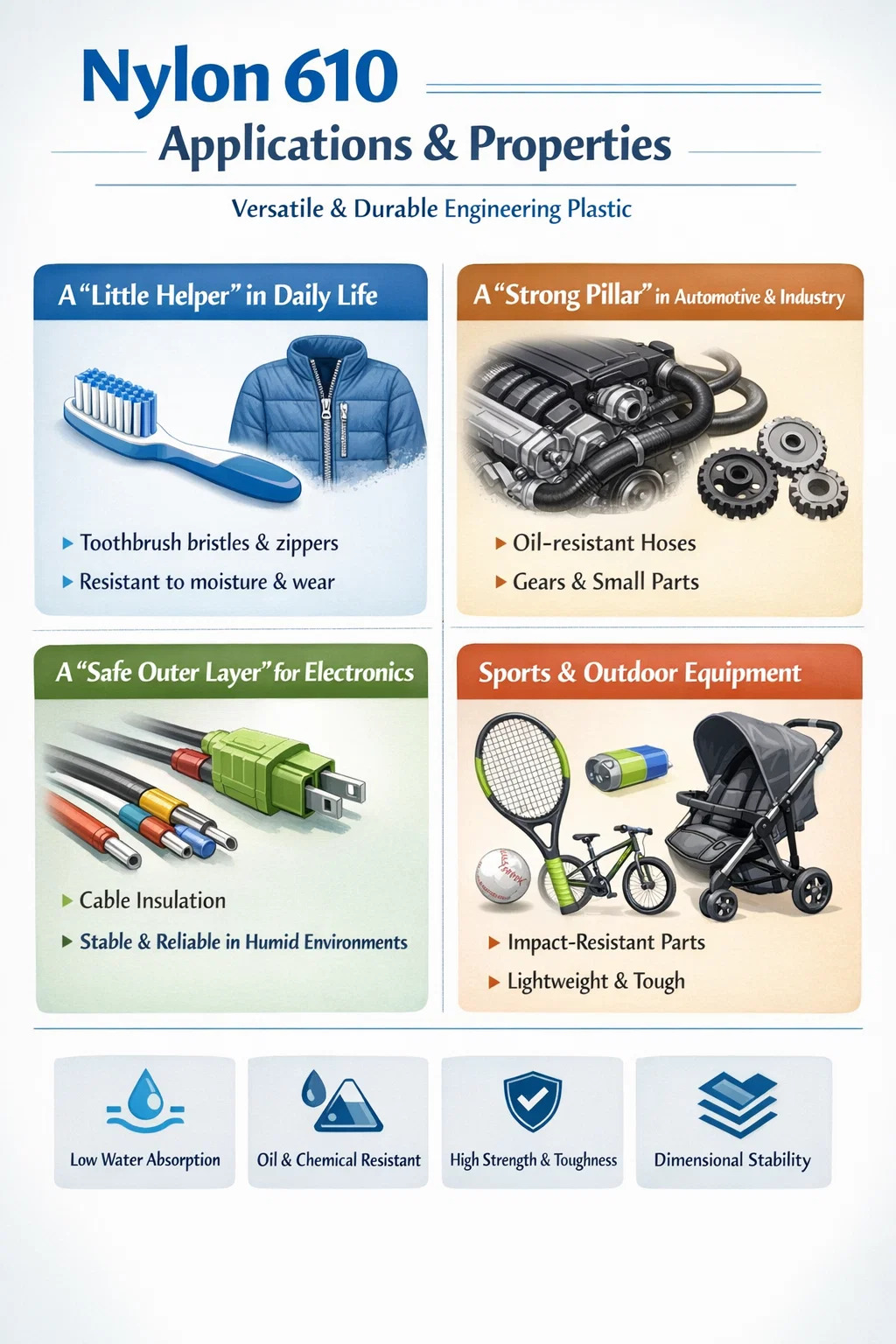 Bàn chải và sợi vải: Lông bàn chải đánh răng và dây kéo trên quần áo của bạn thường được làm bằng nylon 610. So với loại thông thường Nylon 6 , nó hoạt động tốt hơn trong môi trường ẩm ướt, ít bị hấp thụ và biến dạng nước, đồng thời lông bàn chải duy trì độ đàn hồi ngay cả khi sử dụng kéo dài, giúp chúng không bị mềm và khập khiễng.