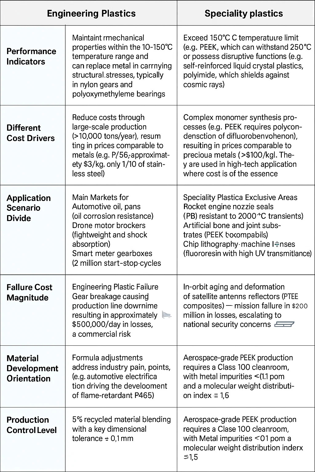 Nhựa đặc biệt: Vượt quá giới hạn nhiệt độ 150°C (ví dụ: PEEK, có thể chịu được 260°C) hoặc sở hữu các chức năng gây rối (ví dụ: nhựa tinh thể lỏng tự gia cố, polyimide, che chắn chống lại tia vũ trụ).